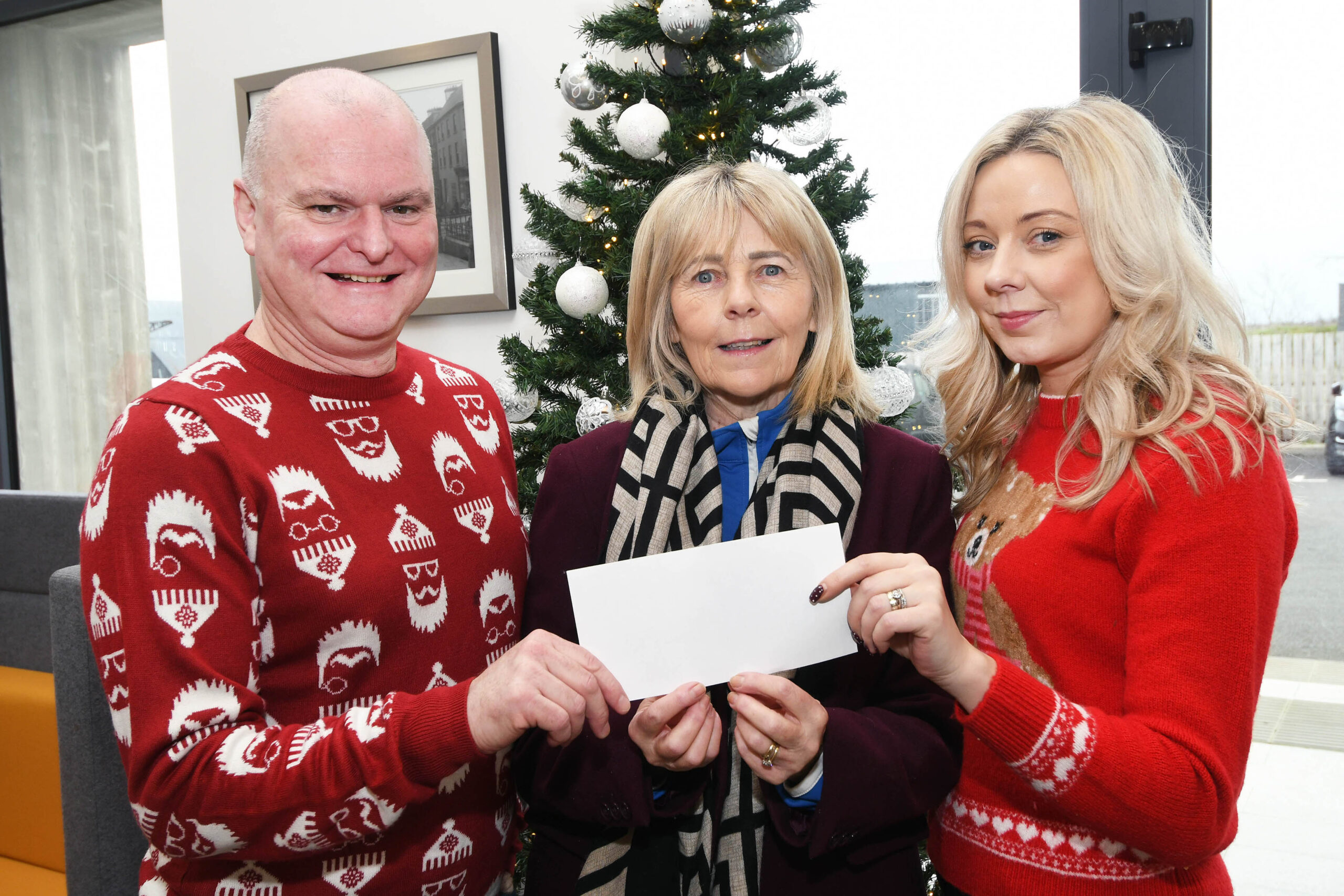 Geraldine McGuinness of Greysteel Playgroup accepts a donation from Braidwater’s Ciarán McMonagle and Jane McKeever.
